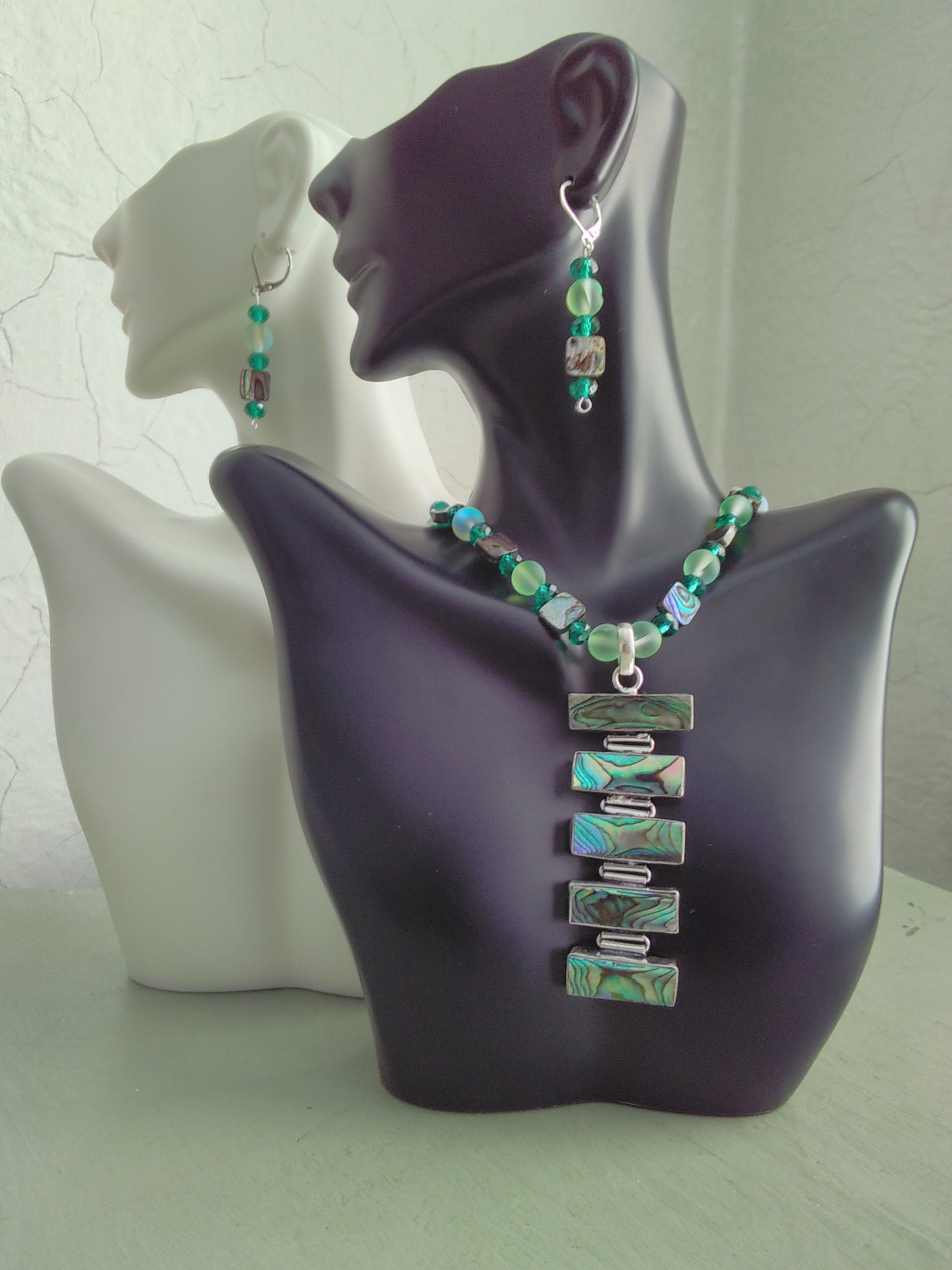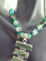 This five tiered abalone pendant is set with green mystic aura topaz beads, square abalone beads wand green crystal beads