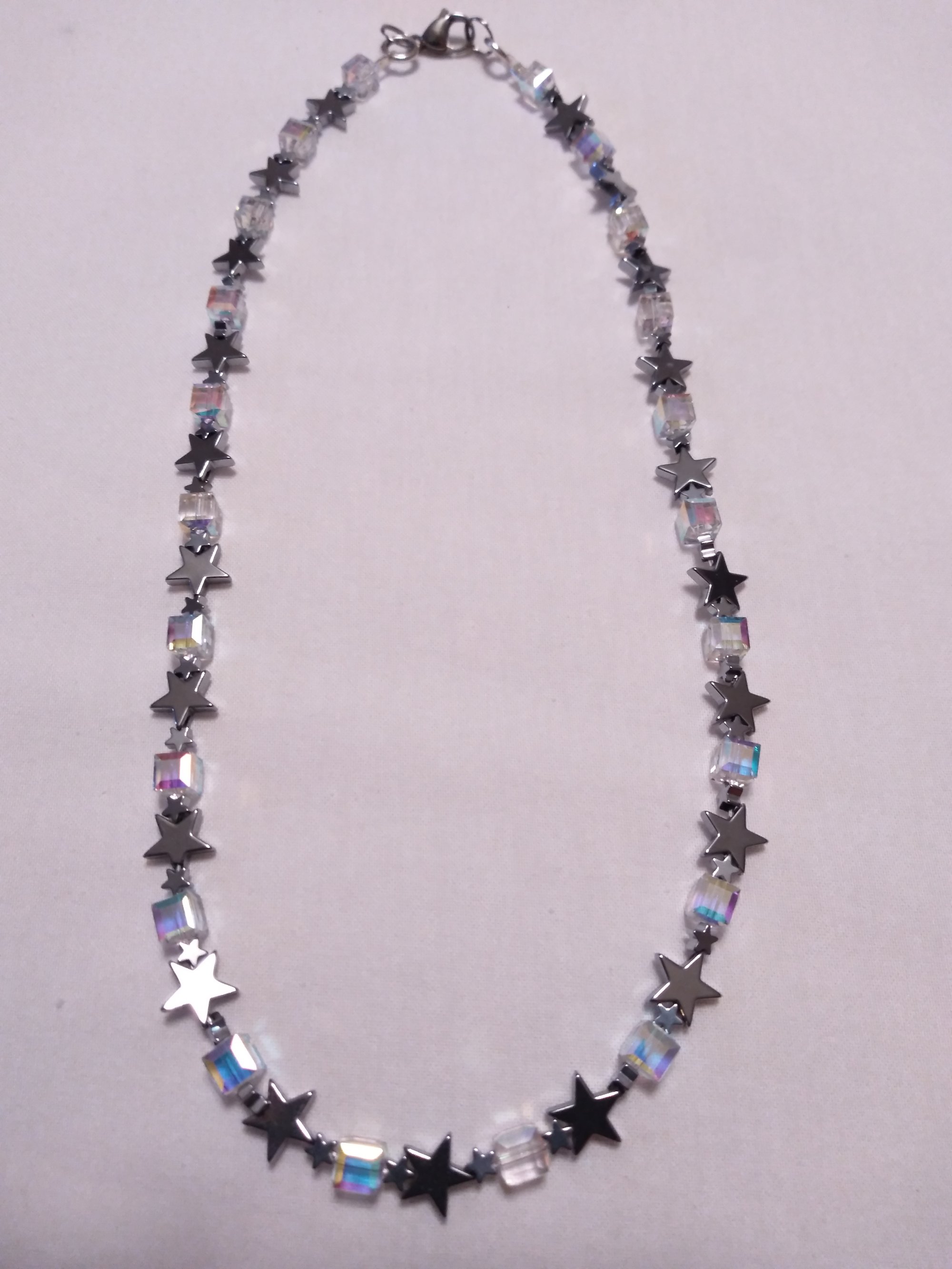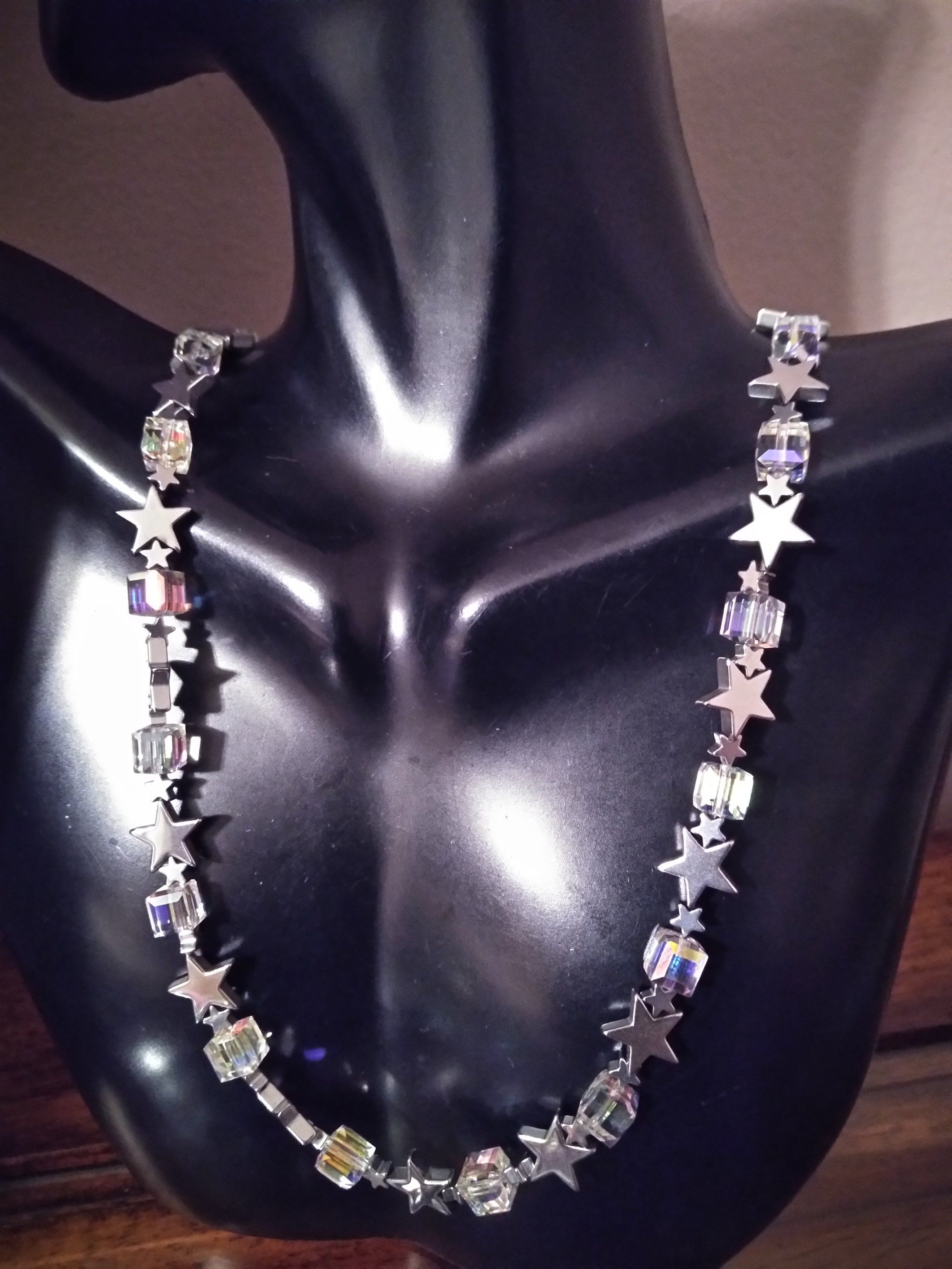 HEMATITE STARS AND SWAROVSKI CUBE BEADS