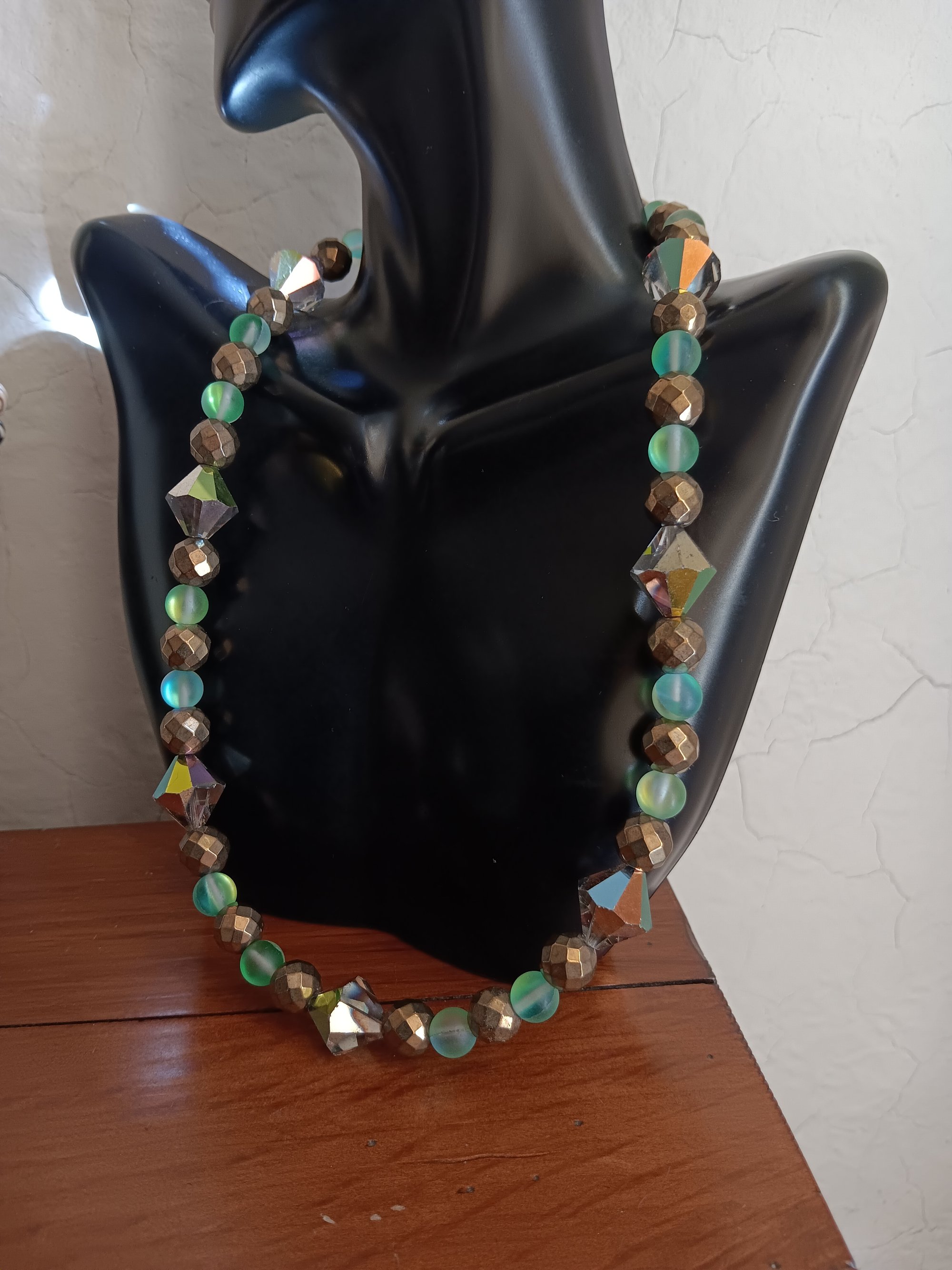 LARGE VITRAIL SWAROVSKI BICONES BEADS, GREEN MYSTIC AND HEMATITE BEADS