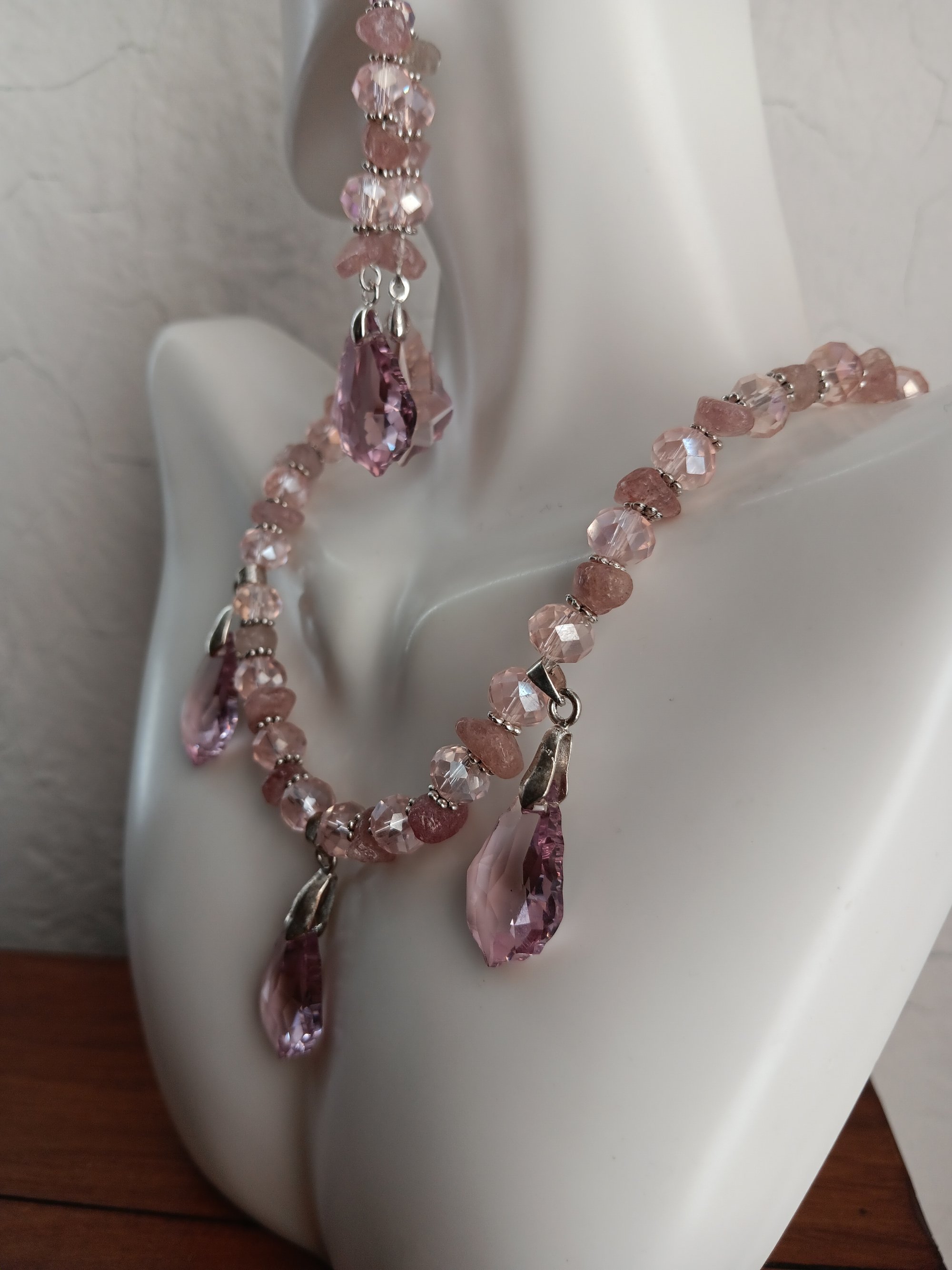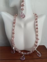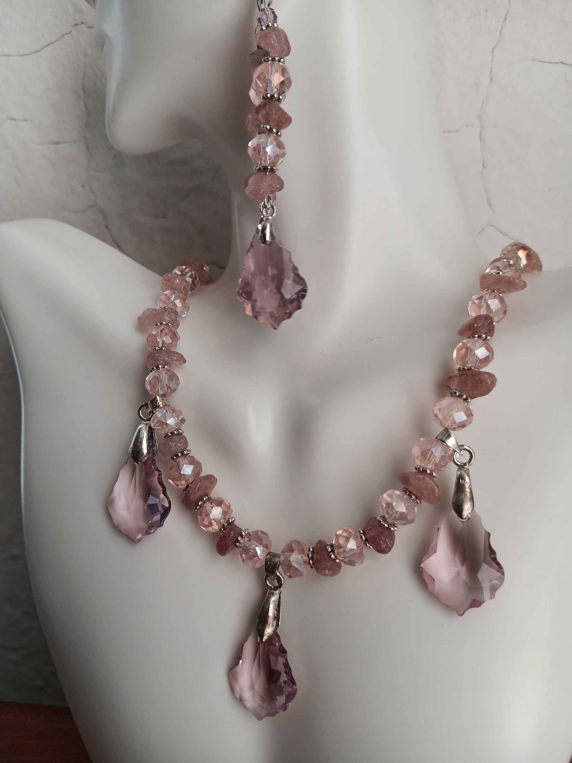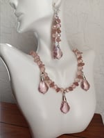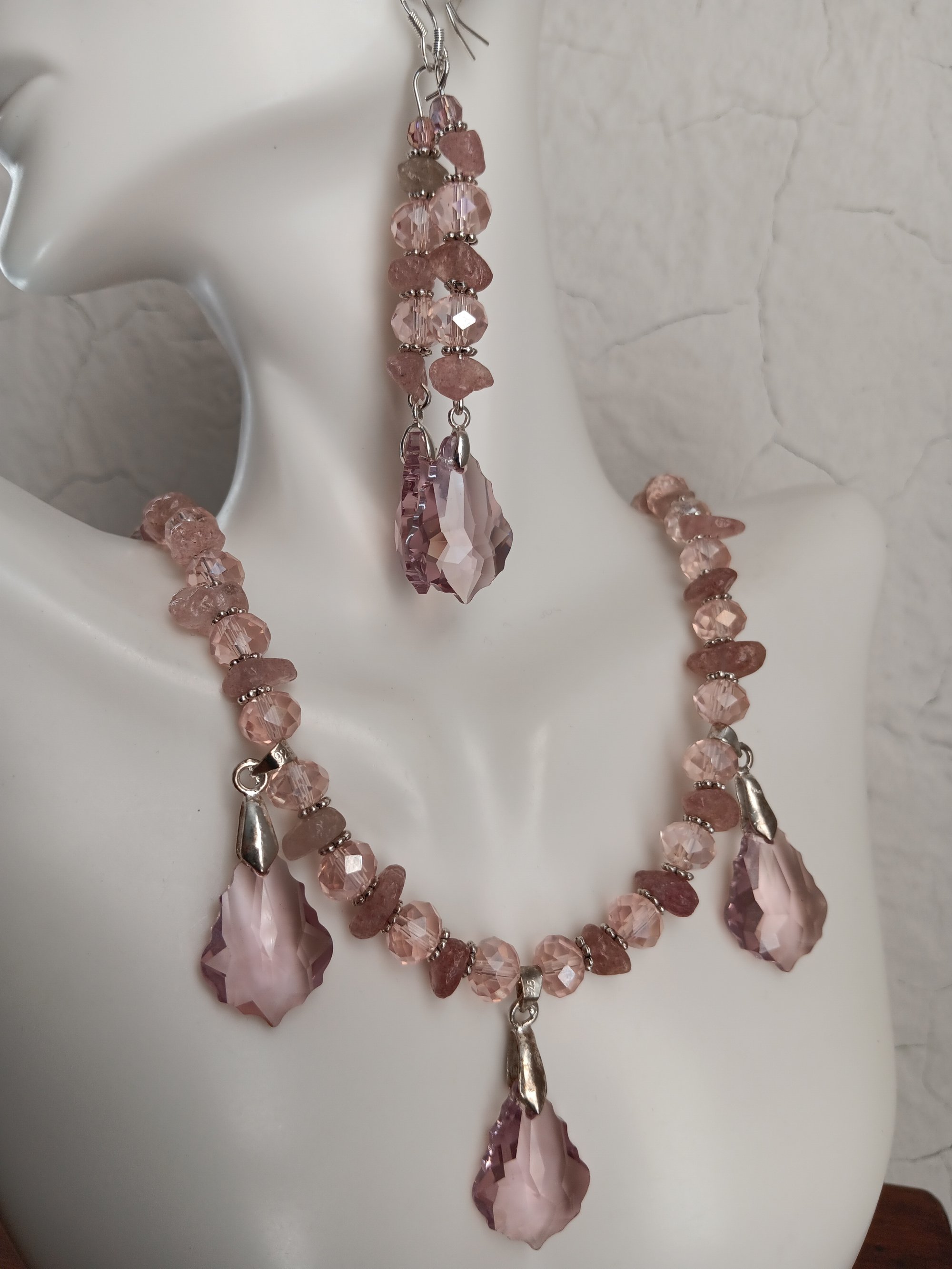PINK CRYSTAL BEADS, HEMATITE SPACERS, ROSE QUARTZ GEMSTONE CHIPS AND PRECIOSA PINK CRYSTAL PENDANTS